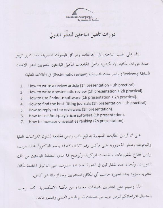 بناء عى طلب الباحثين فى الجامعات المصرية ومراكز البحوث المصرية , فقد تقرر توفير خدمة دورات مكتبة الأسكندرية داخل الجامعات لتأهيل الباحثين المصريين لنشر الأبحاث السابقة والدراسات التصنيفية.