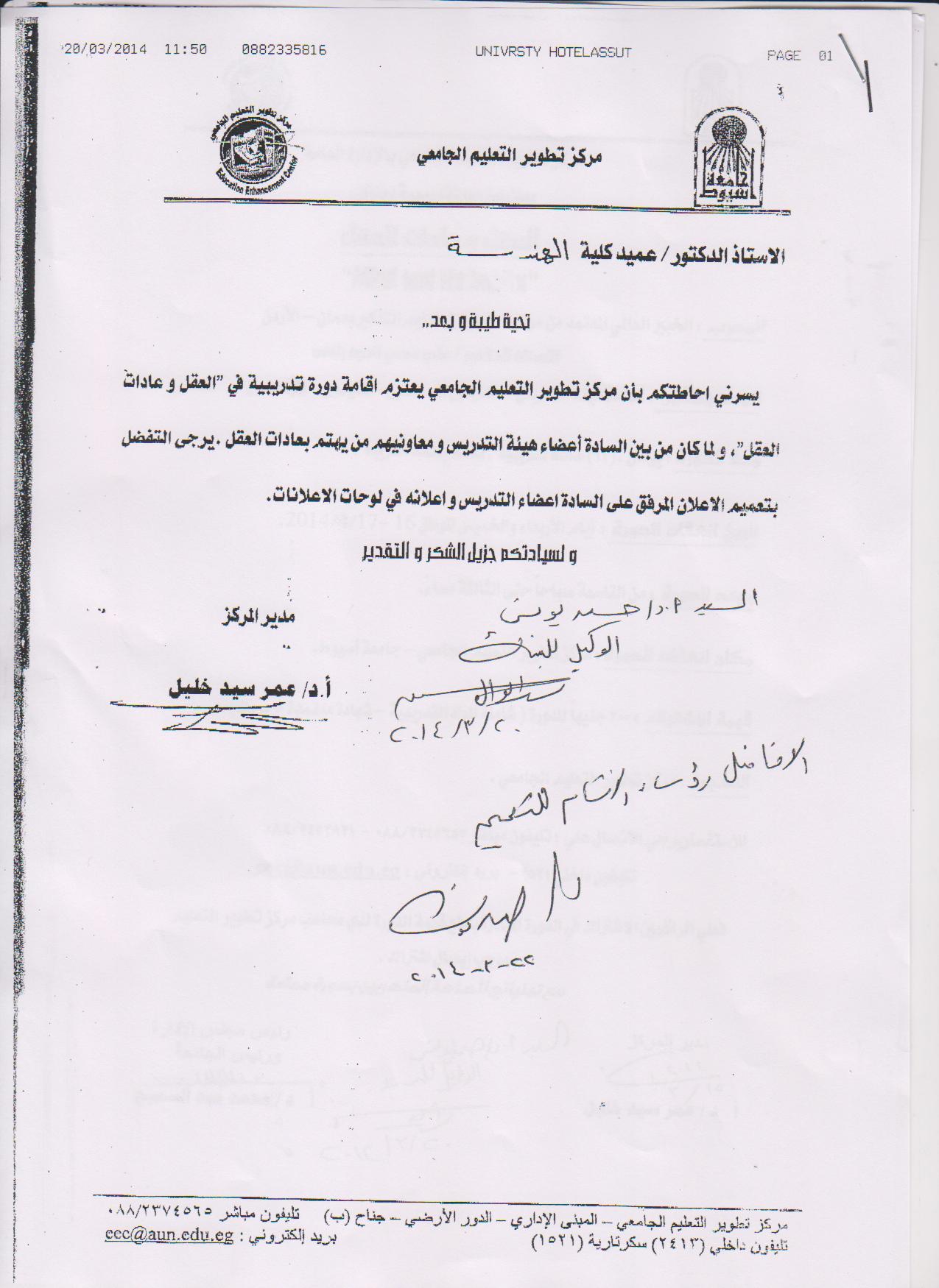 دورة تدريبية بعنوان العقل وعادات العقل 25 مارس 2014 سوف يعقد مركز التطوير الجامعى دورة تدريبية فى العقل وعادات العقل وذلك يوم الأربعاء والخميس الموافق 16-17 ابريل 2014 قيمة الإشتراك 300 جنيه للدورة