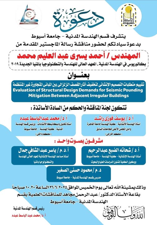 دعوة 25 يونيو 2025 يتشرف قسم الهندسة المدنية بدعوة سيادتكم لحضور مناقشة رسالة الماجستير المقدمة من المهندس أحمد يسري عبد العليم، يوم الخميس الموافق ٢٦-٦-٢٠٢٥ بقاعة المناقشات بقسم الهندسة المدنية(قاعة ا.د. عبد الرحمن مجاهد) الساعة العاشرة والنصف صباحا.