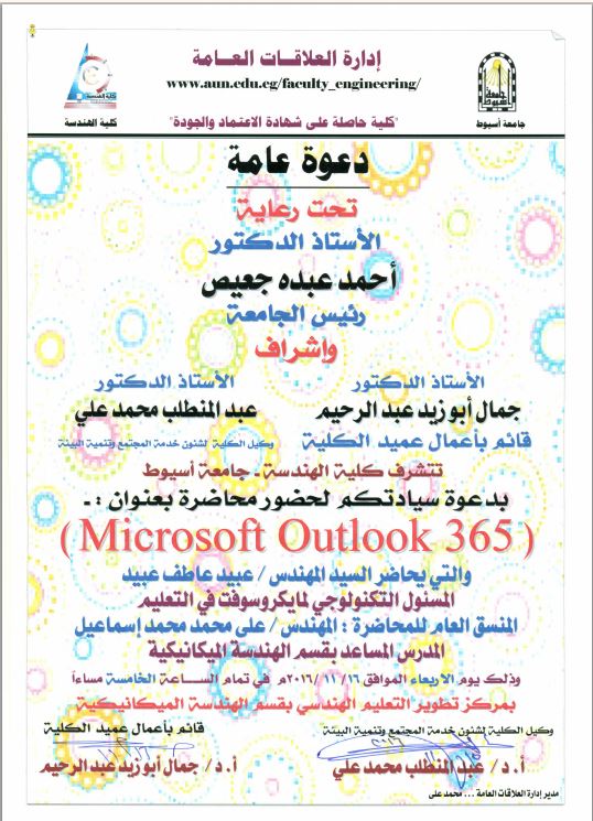 والتي يحاضر فيها المهندس عبيد عاطف عبيد المسئول التكنولوجى لميكروسوفت فى التعليم وذلك يوم الأربعاء الموافق 16-11-2016 فى تمام الساعة الخامسة مساءاً بمركز تطوير التعليم الهندسى بقسم الهندسة الميكانيكية