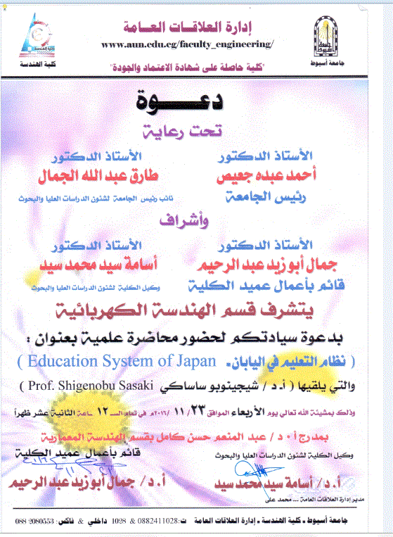 دعوة عامة لحضور محاضرة علمية بعنوان (نظام التعليم فى اليابان) 22 نوفمبر 2016 دعوة عامة لحضور محاضرة علمية بعنوان (نظام التعليم فى اليابان)