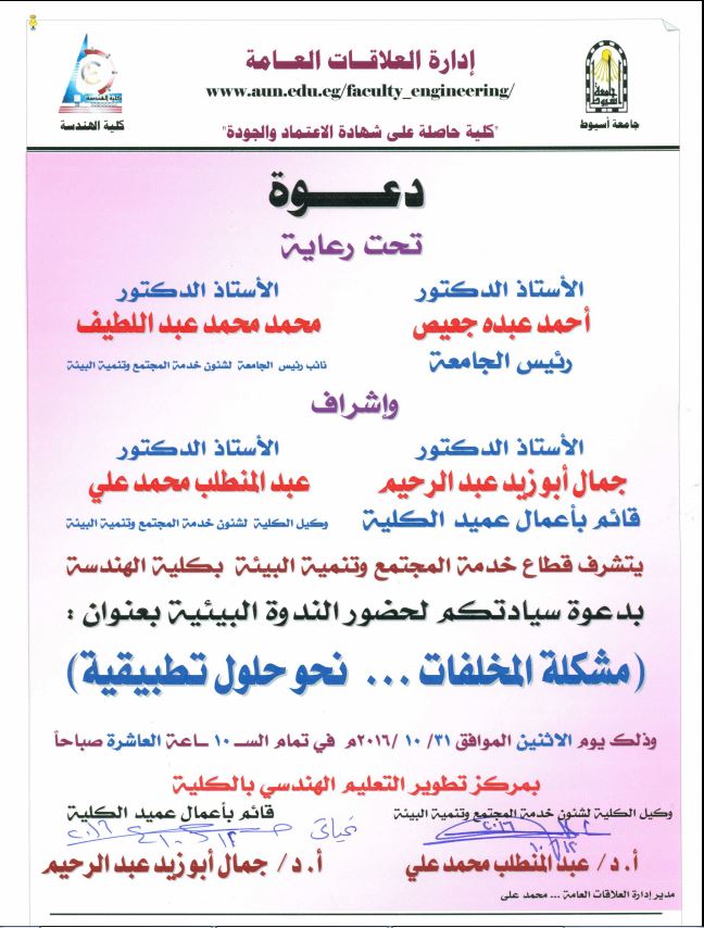 دعوة عامة لحضور ندوة بيئية بعنوان "مشكلة المخلفات... نحو حلول تطبيقية" 27 أكتوبر 2016 يتشرف قطاع خدمة المجتمع وتنمية البيئة بكلية الهندسة بدعوة سيادتكم لحضور ندوة بيئية بعنوان "مشكلة المخلفات... نحو حلول تطبيقية" وذلك يوم الإثنين الموافق 31-10-2016 فى الساعة العاشرة صباحاً بمركز تطوير التعليم
