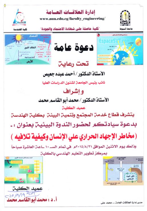 دعوة عامة من كلية الهندسة لحضور ندوة ( مخاطر الإجهاد الحرارى على الإنسان وكيفية تلافيه) 19 أغسطس 2015 دعوة عامة من كلية الهندسة لحضور ندوة ( مخاطر الإجهاد الحرارى على الإنسان وكيفية تلافيه)