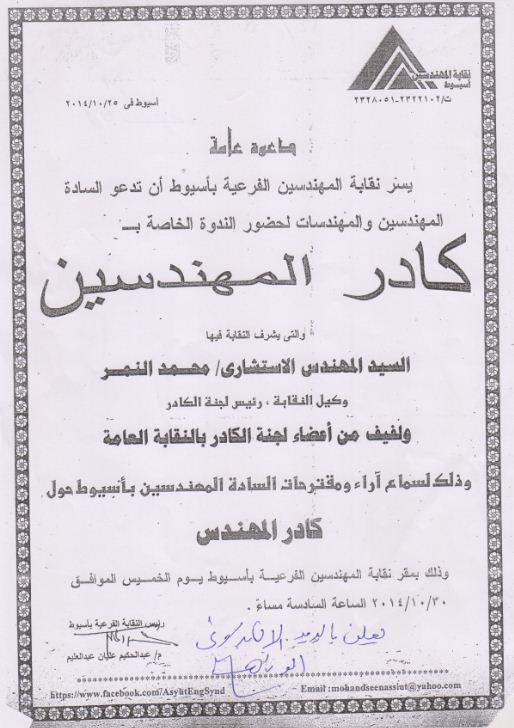 وذلك لسماع آراء ومقترحات السادة المهندسين بأسيوط حول كادر المهندسين وذلك بمقر النقابة يوم الخميس الموافق 30/10/2014