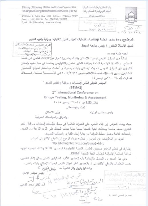 دعوة حضور الجلسة الإفتتاحية و الفاعليات للمؤتمر الدولى لاختبارات و مراقبة و تقييم الكبارى 27 ديسمبر 2015 دعوة حضور الجلسة الإفتتاحية و الفاعليات للمؤتمر الدولى لاختبارات و مراقبة و تقييم الكبارى