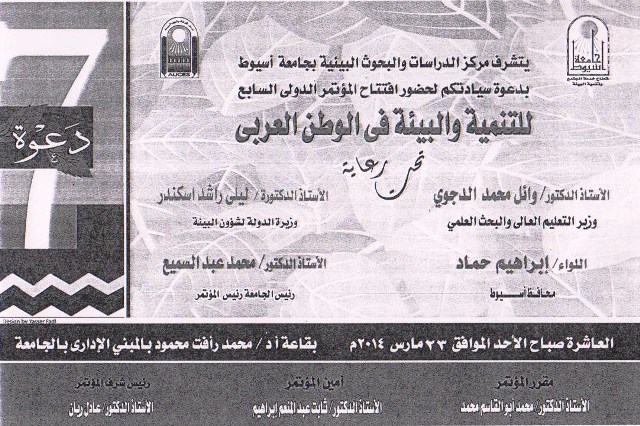 دعوة حضور المؤتمر الدولى السابع للتنمية والبيئة فى الوطن العربى فى العاشرة صباح الأحد الموافق 23 مارس 2014 بقاعة أ.د/محمد رأفت محمود بالمبنى الإدارى بالجامعة