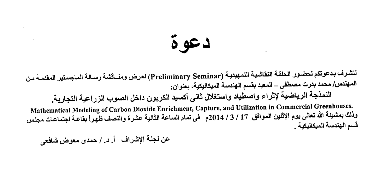 دعوة حضور حلقة نقاشية تمهيدية لعرض رسالة الماجستير من المهندس/ محمد بدرت مصطفى المعيد بقسم الهندسة الميكانيكية بعنوان: