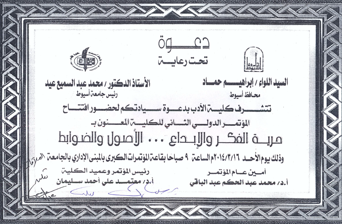 دعوة حضور مؤتمر الدولى الثانى لكلية آداب 15 مارس 2014 ارسلت كلية الآداب دعوة حضور مؤتمر الدولى الثانى للكلية المعنون بـ حرية الفكر والإبداع ... الأصول والضوابط وذلك يوم الإحد الموافق 16/3/2014م الساعة التاسعة صباحا بقاعة المؤتمرات الكبرى بالمبنى الإدارى للجامعة