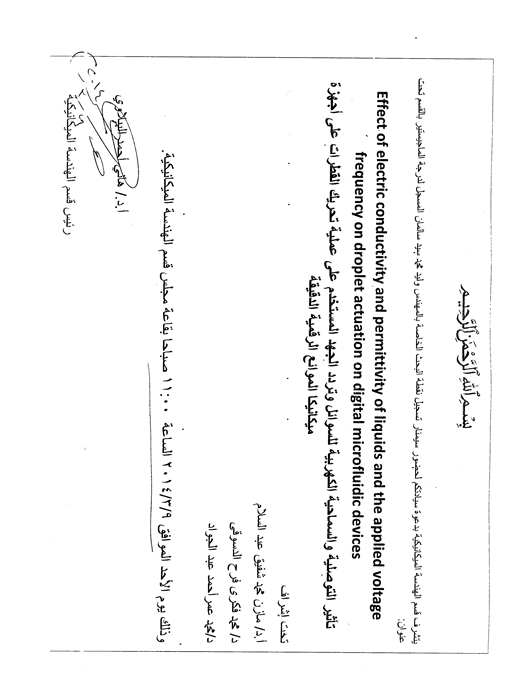 تأثير الوصلة والسماحية الكهربية للسوائل وتردد الجهد المستخدم على تحريك القطرات على اجهزة ميكانيكا الموانع الرقمية الدقيقة
