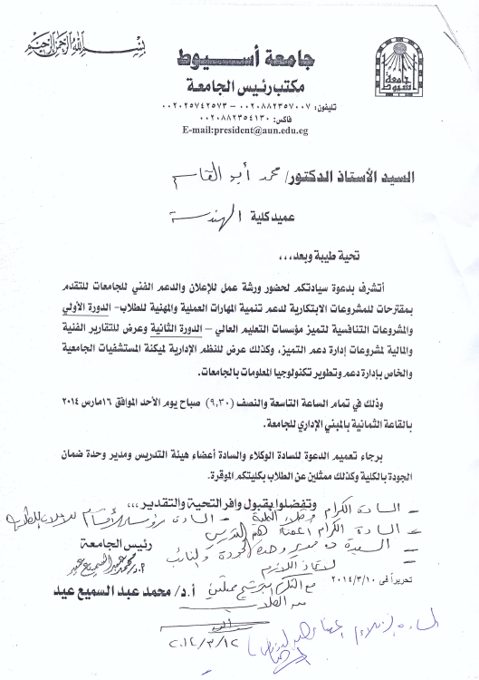 دعوة حضور ورشة العمل للإعلان والدعم الفنى للجامعات للتقدم بمشروعات الإبتكارية لدعم تنمية المهارات العملية والمهنية للطلاب ـالدورة الأولى والمشروعات التنافسية لتميز مؤسسات التعليم العالى ـ الدورة الثانية وعرض التقارير الفنية والمالية لمشروعات ادارة دعم التميز وكذلك عرض للنظم الإدارية لميكنة المستشفيات الجامعية .