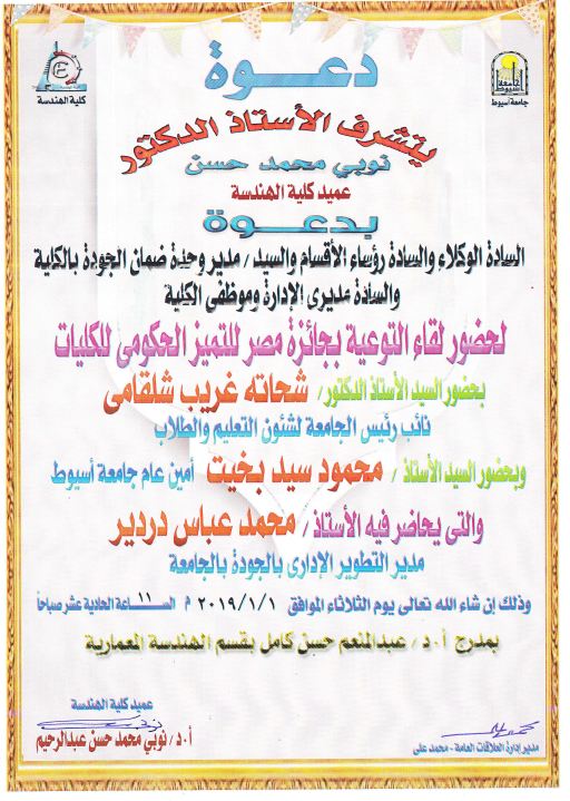 دعوة لحضور لقاء التوعية بجائزة مصر للتميز الحكومى للكليات 31 ديسمبر 2018 دعوة لحضور لقاء التوعية بجائزة مصر للتميز الحكومى للكليات