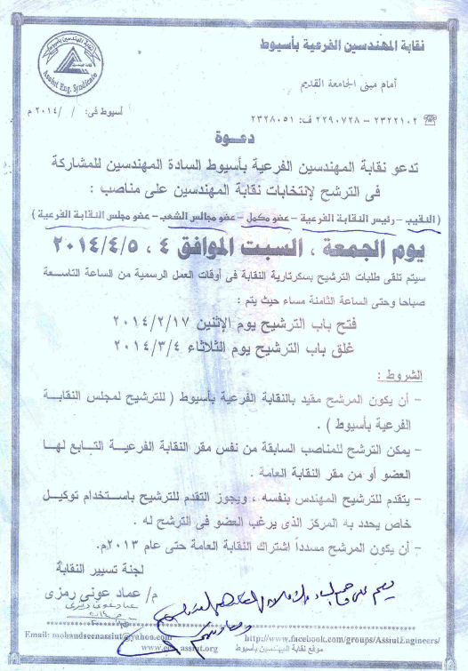 تدعو نقابة المهندسين الفرعية باسيوط السادة المهندسين للمشاركة فى الترشح لانتخابات نقابة المهندسين على مناصب