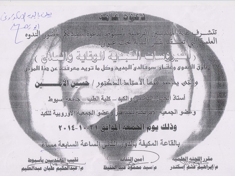 دعوة من نقابة المهندسين لحضور ندوة ( الفيروسات الكبدية الوقاية والعلاج ) 30 أكتوبر 2014 تتشرف نقابة المهندسين الفرعية بأسيوط بدعوة سيادتكم لحضور الندوة العلمية التى تعقد بمقر النقابة تحت عنوان ( الفيروسات الكبدية الوقاية والعلاج ) والتى يحاضر فيها الأستاذ الدكتور /حسين الأمين وذلك يوم الجمعة الموافق 31/10/2014