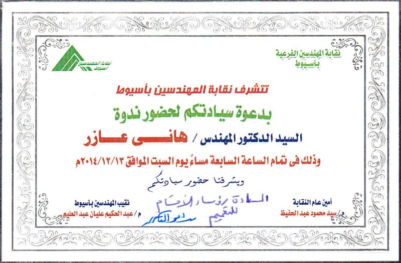 دعوة من نقابة المهندسين لحضور ندوة السيد الدكتور/ هانى عازر 9 ديسمبر 2014 تتشرف نقابة المهندسين بأسيوط بدعوة مسيادتكم لحضور ندوة السيد الدكتور المهندس/ هانى عازر وذلك ى تمام الساعة السابعة مساء يوم السبت الموافق 13/12/2014