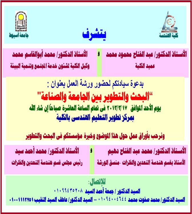ينظم قطاع خدمة المجتمع وتنمية البيئة بكلية الهندسة مع قسم هندسة التعدين والفلزات بالكلية ورشة عمل بعنوان "البحث والتطوير بين الجامعة والصناعة"يوم الأحد الموافق 17/3/2013 فى تمام الساعة العاشرة صباحاً بمركز تطوير التعليم الهندسى بالكلية