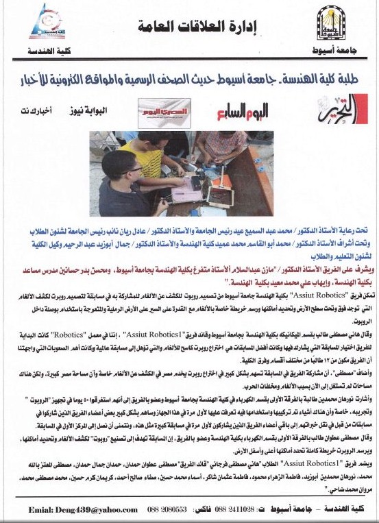 فريق "Assiut Robotics" بكلية الهندسة جامعة أسيوط يصمم روبوت للكشف عن الألغام 27 يوليو 2015 فريق "Assiut Robotics" بكلية الهندسة جامعة أسيوط يصمم روبوت للكشف عن الألغام