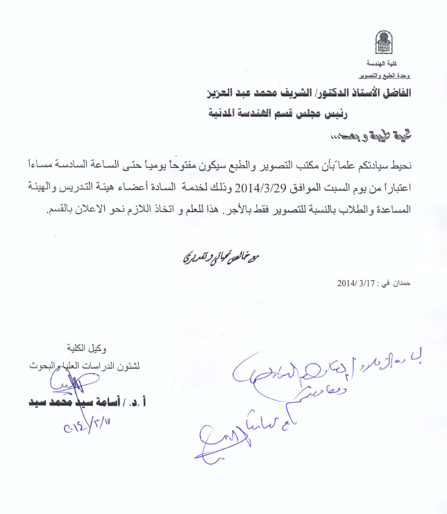 سوف يتم بمشيئة الله فتح مكتب التصوير يومياً حتى السادسة مساءاً اعتباراً من يوم السبت الموافق 29/3/2014 وذلك لخدمة السادة أعضاء هيئة التدريس والهيئة المساعدة والطلاب بالنسبة للتصوير فقط بالأجر.