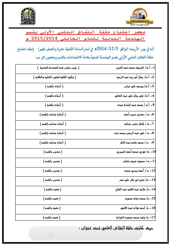 حلقة النقاش العلمي الأولي بقسم الهندسة المدنية للعام الجامعى 2014/2015 5 مارس 2015 حلقة النقاش العلمي الأولي بقسم الهندسة المدنية للعام الجامعى 2014/2015