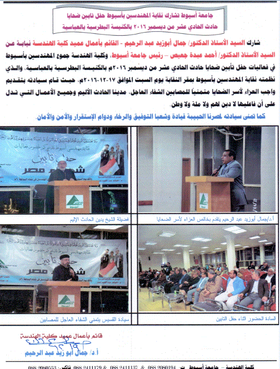 جامعة أسيوط تشارك نقابة المهندسين بأسيوط حفل تأبين ضحايا حادث الكنيسة البطرسية بالعباسية 20 ديسمبر 2016 جامعة أسيوط تشارك نقابة المهندسين بأسيوط حفل تأبين ضحايا حادث الكنيسة البطرسية بالعباسية