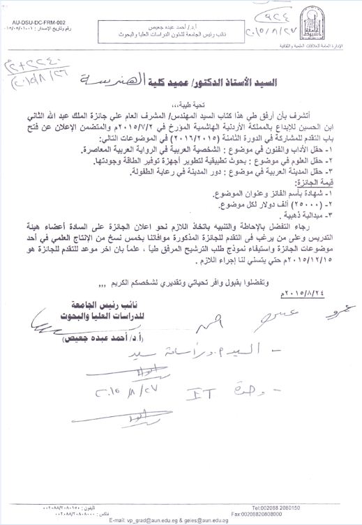 جائزة الملك عبدالله الثانى ابن الحسين للإبداع 29 أغسطس 2015 يعلن مجلس أمناء الجائزة عن فتح باب التقدم للمشاركة فى الدورة الثامنة (2015-2016)