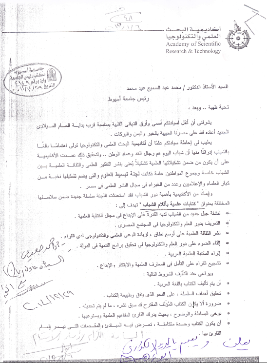 كتابات علمية بأقلام الشباب 13 يناير 2015 ايماناً من أكاديمية البحث العلمى والتكنولوجيا بدور الشباب فقد استحدثت لجنة تبسيط العلوم والتى يضم تشكيلها نخبة من كبار العلماء والإعلاميين وعدد من الخبراء فى مجال النشر العلمى سلسلة جديدة ضمن سلاسلها المختلفة بعنوان كتابات علمية بأقلام الشباب.