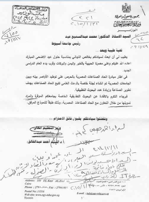 مبادرة اتحاد الصناعات المصرية 1 فبراير 2015 فى إطار مبادرة اتحاد الصناعات المصرية بالحرص على توطيد الأواصر بينه وبين الجامعات المصرية تم إنشاء لجنة خاصة بالبحث العلمى تتبع اتحاد الصناعات بهدف تطوير الصناعة وزيادة عدد البحوث التطبيقية.