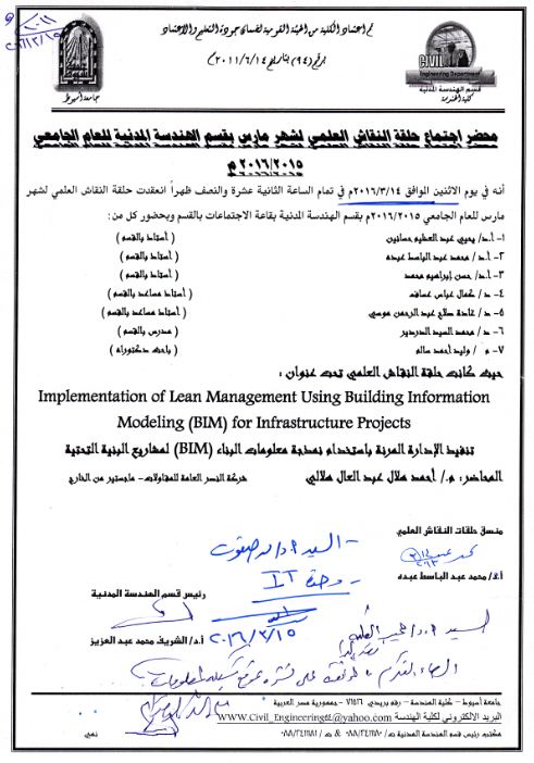 محضر اجتماع حلقة النقاش العلمى لشهر مارس بقسم الهندسة المدنية للعام الجامعى 2015/2016 16 مارس 2016 محضر اجتماع حلقة النقاش العلمى لشهر مارس بقسم الهندسة المدنية للعام الجامعى 2015/2016