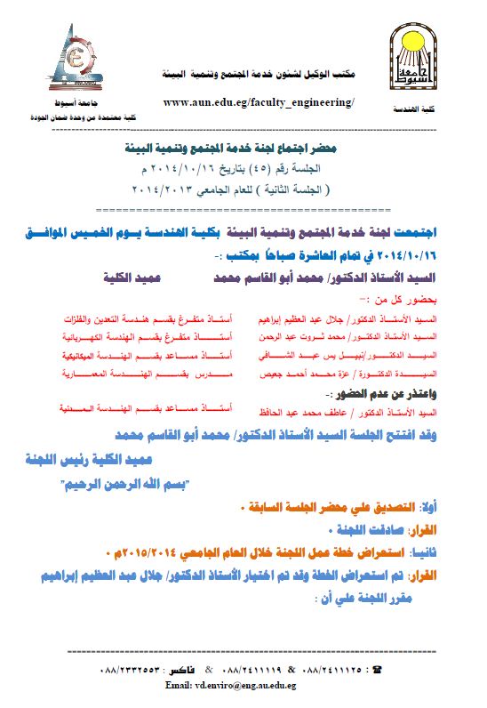 محضر اجتماع لجنة خدمة المجتمع وتنمية البيئة بتاريخ 16/10/2014 19 أكتوبر 2014 محضر اجتماع لجنة خدمة المجتمع وتنمية البيئة بتاريخ 16/10/2014