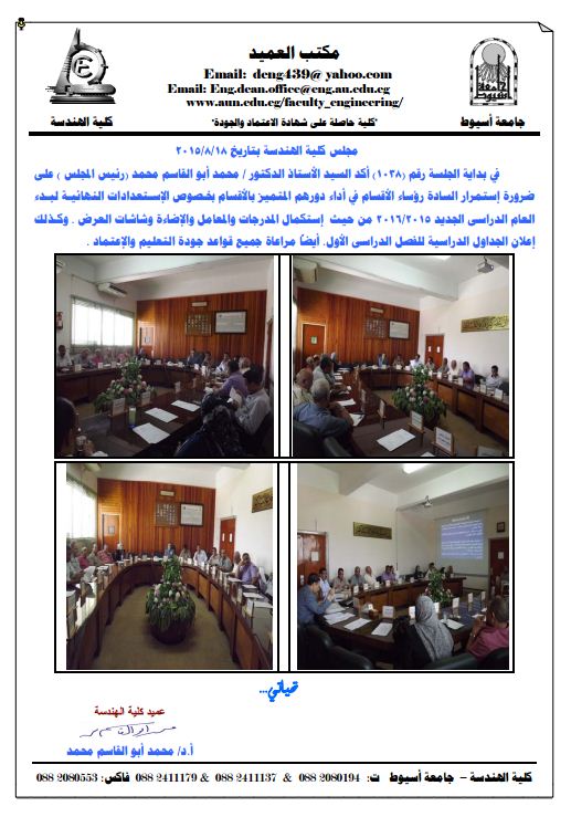 في بداية الجلسة رقم (١٠٣٨) أكد السيد الأستاذ الدكتور / محمد أبو القاسم محمد (رئيس المجلس) على ضرورة إستمرار السادة رؤساء الأقسام في أداء دورهم المتميز بالأقسام بخـصوص الإسـتعدادات النهائيـة لبـدءالعام الدراسى الجديد ٢٠١٦/٢٠١٥ من حيث إستكمال المدرجات والمعامل والإضاءة وشاشات العرض وكـذلك إعلان الجداول الدراسية للفصل الدراسى الأول . أيضا مراعاة جميع قواعد جودة التعليم والإعتماد .