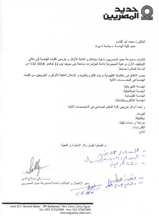 تتشرف مجموعة حديدد المصرين بدعوة سيادتكم والطلبة الأوال وخريجى كليات الهندسة الى ملتقى التوظيف الأول برعاية المجموعة بقاعة المؤتمرات بجامعة بنى سويف يوم 11 نوفمبر 2014 ابتدءأ من الساعة العاشرة صباحاً.