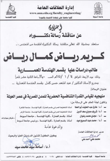 ستعقد بمشيئة الله تعالى مناقشة رسالة الماجيستير المقدمة من المهندس كريم رياض كمال رياض طالب دراسات عليا بقسم الهندسة المعمارية وذلك يوم الأربعاء الموافق 14/1/2015 الساعة الثانية عشر ظهراً بمدرج الأستاذ الدكتور / عبد المنعم حسن كامل بقسم الهندسة المعمارية