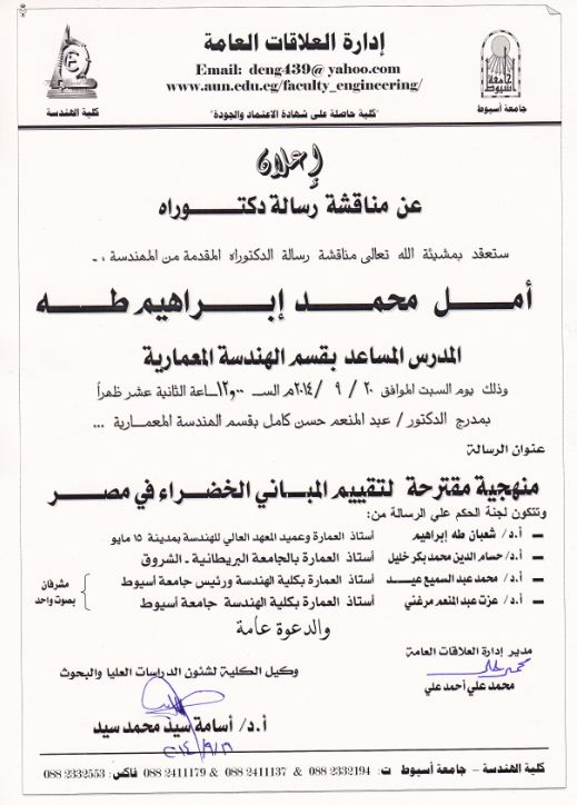 مناقشة رسالة الدكتوراة المقدمة من المهندس / أمل محمد ابراهيم طه 16 سبتمبر 2014 مناقشة رسالة الدكتوراة المقدمة من المهندس / أمل محمد ابراهيم طه