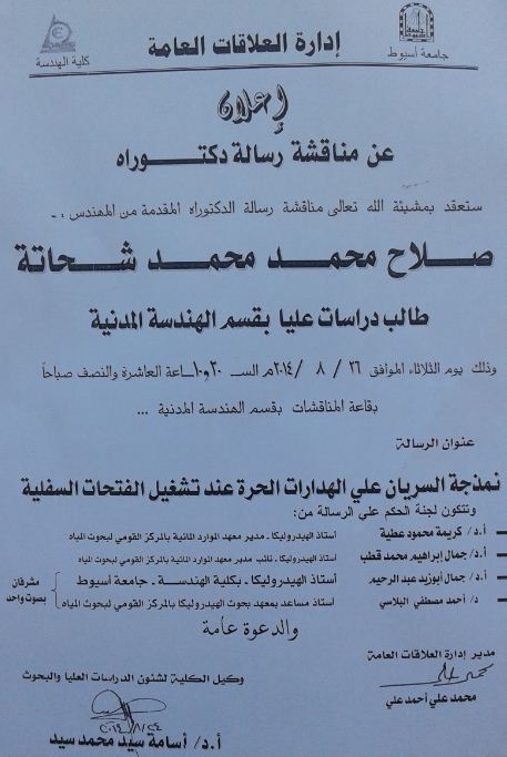 سوف تعقد بمشيئة الله تعالى مناقشة رسالة الماجستير المقدمة من المهندس/ صلاح محمد محمد شحاتة