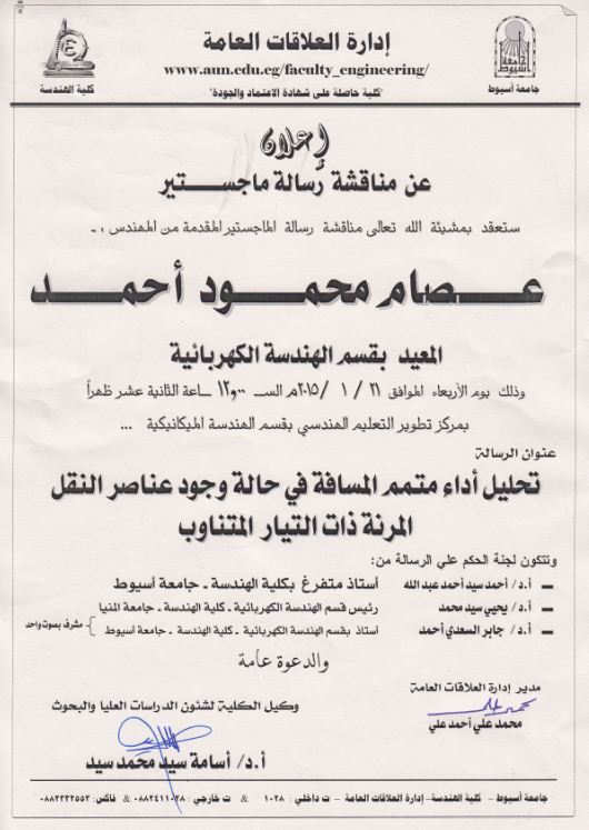 مناقشة رسالة الماجستير المقدمة من المهندس/ عصام محمود أحمد 20 يناير 2015 مناقشة رسالة الماجستير المقدمة من المهندس/ عصام محمود أحمد