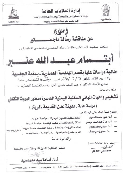 ستعقد بمشيئة الله تعالى مناقشة رسالة الدكتوراة المقدمة من المهندس... ابتسام عبدالله عنبر طالبة دراسات عليا بقسم الهندسة المعمارية - يمنية الجنسية وذلك يوم الثلاثاء الموافق 17/2/2015الساعة الثانية عشرظهراً بمدرج الأستاذ الدكتور/ عبدالمنعم حسن كامل