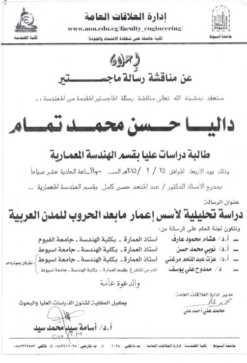 سوف تعقد بمشيئة الله مناقشة رسالة الماجستير المقدمة من المهندسة
