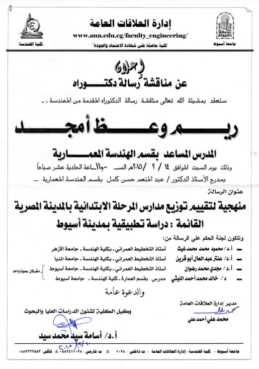 مناقشة رسالة الماجستير المقدمة من المهندسة/ ريم وعظ أمجد 12 فبراير 2015 ستعقد بمشيئة الله تعالى مناقشة رسالة الدكتوراة المقدمة من المهندس... ريم وعظ أمجد المدرس المساعد بقسم الهندسة المعمارية وذلك يوم السبت الموافق 14/2/2015الساعة الحادية عشر صباحاً بمدرج الأستاذ الدكتور/ عبدالمنعم حسن كامل