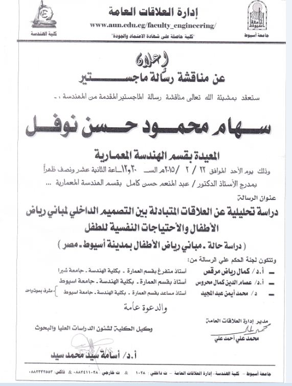 ستعقد بمشيئة الله تعالى مناقشة رسالة الدكتوراة المقدمة من المهندس... سهام محمود حسن نوفل المعيدة بقسم الهندسة المعمارية وذلك يوم الأحد الموافق 22/2/2015الساعة الثانية عشر ونصف ظهراً بمدرج الأستاذ الدكتور/ عبدالمنعم حسن كامل