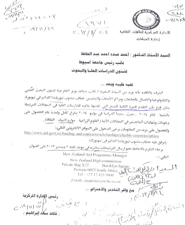 فتح باب التقدم للمرة الثانية للمنح التى تقدمه نيوزيلندا للدراسات العليا فى المجالات المرتبطة بالتنمية لعام 2014 حيث ستبدأ الدراسة فى يوليو 2014 بتفرغ كامل ولمدة عام للحصول على دبلومات وشهادات الماجستير فى المجالات الآتية (العلوم الزراعية - موارد المياه - الطاقة ).ولمزيد من المعلومات
