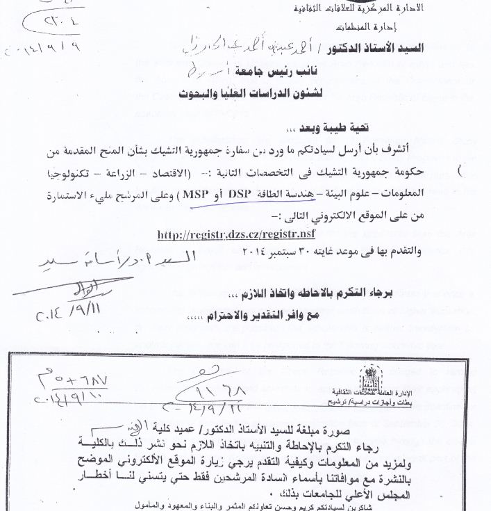 ورد من سفارة التشيك بشأن المنح المقدمة من حكومة جمهورية التشيك فى التخصصات التالية (الأقتصاد - الزراعة- تكنولوجيا المعلومات -علوم البيئة - هندسة الطاقة) وعلى المرشح ملئ الإستمارة من على الموقع الإلكترونى التالى :-