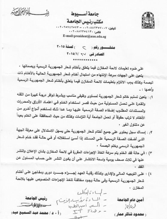 منشور رقم 2 الخاص بلائحة المخازن ( استبدال أختام شعار الجمهورية ) 8 فبراير 2015 منشور رقم 2 الخاص بلائحة المخازن ( استبدال أختام شعار الجمهورية )