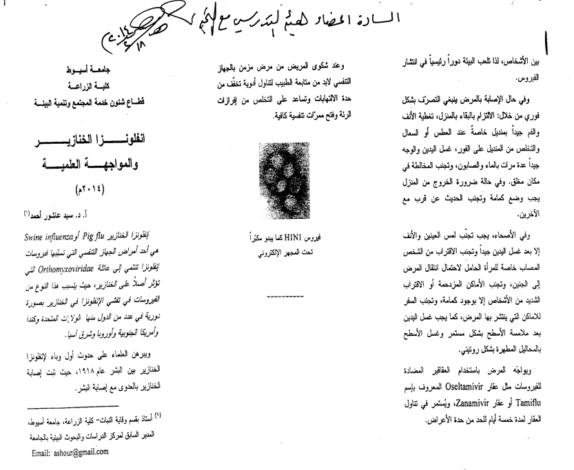 فى اطار مساهمة قطاع شئون خدمة المجتمع وتنمية البيئة بالكلية فى مواجهة المشكلات البيئية المعاصرة قد  نشرت مقالة علمية  حول مواجهة داء انفلونزا الخنازير للدكتور/سيد عاشور أحمد الأستاذ  بالكلية المدير السابق لمركز الدراسات والبحوث البئية بالجامعة