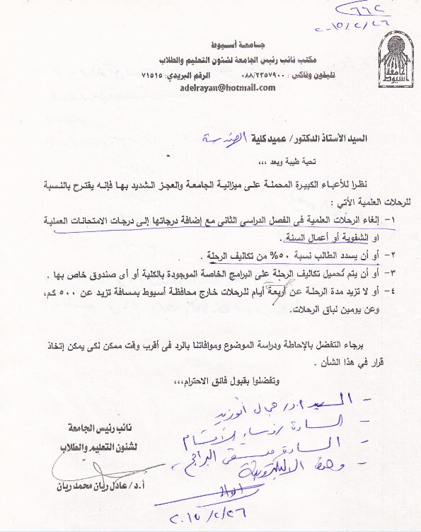 نظراً للأعباء الكبيرة المحملة على ميزانية الجامعة والعجز الشديد بها فإنه يقترح بالنسبة للرحلات العلمية الآتى:
