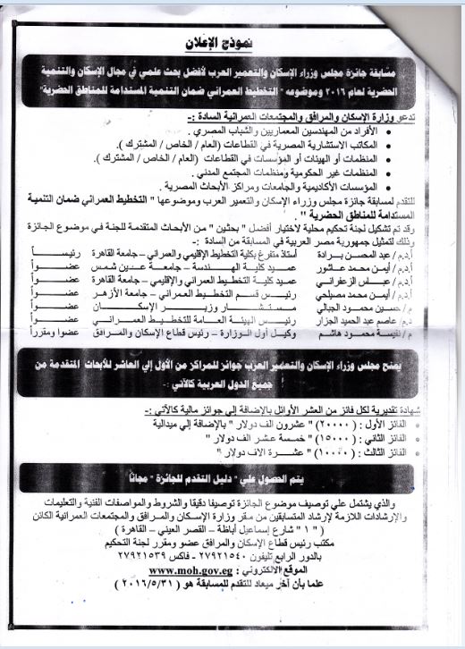 مسابقة مجلس وزراء الإسكان و التعمير لأفضل بحث علمى فى مجال الإسكان و التنمية الحضرية لعام 2016 9 مارس 2016 مسابقة مجلس وزراء الإسكان و التعمير لأفضل بحث علمى فى مجال الإسكان و التنمية الحضرية لعام 2016