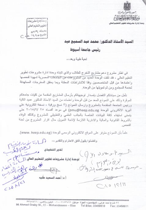 فى إطار مشروع دعم مشاريع التخرج للطلاب والذى تتبناه وحدة إدارة مشروعات تطوير التعليم العالى، فقد تلقت الوحدة العديد من المشروعات من الجامعات المصرية تمهيداً لفحصها واعتمادها من قبل المتخصصين وذلك وفقاً للإشتراطات المعلنة وبما يحقق المستخرجات المستهدفة لخدمة المجتمع ومن ثم تمويلها من الوحدة.
