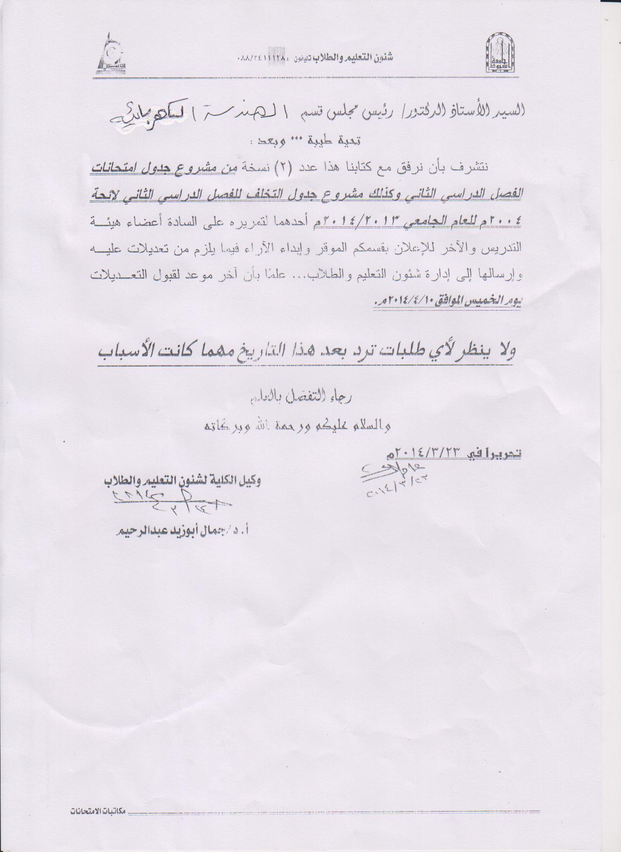 مشروع جدول امتحانات الفصل الدراسى الثانى وكذلك مشروع جدول التخلف للفصل الدراسى الثانى لائحة 2004م للعام الجامعى 2013/2014 م أحدهما لتمريرة على السادة أعضاء هيئة التدريس والآخر للإعلان بقسمكم الموقر وإبداء الرأى فيما يلزم من تعديلات عليه وارسالها الى ادارة شئون طلاب ..علماً بأن اخر موعد لقبول التعديلات يوم الخميس الموافق 10/4/2014م
