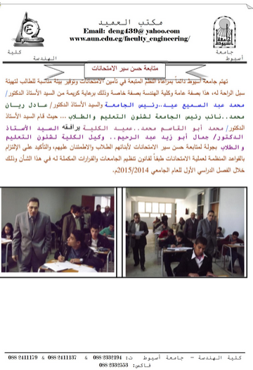 تهتم جامعة أسيوط دائماً بمراعاة النظم المتبعة في تأمين الامتحانات وتوفير بيئة مناسبة للطالب لتهيئة سبل الراحة له، هذا بصفة عامة وكلية الهندسة بصفة خاصة وذلك برعاية كريمة من السيد الأستاذ الدكتور/ محمد عبد السميع عيد..رئيس الجامعة والسيـد الأستاذ الدكتور/ عادل ريان محمد..نائب رئيس الجامعة لشئون التعليم والطلاب ... حيث قـام السيـد الأستاذ الدكتور/ محمد أبو القاسم محمد..عميد الكلية يرافـقه السيد الأستاذ الدكتور/ جمال أبو زيد عبد الرحيم.. وكيل الكلية لشئون التعليم والطلاب بجولة لمتابعة حسن سير الامتحانات لأبنائهم الطلاب والاطمئنان عليهم، والتأكيد على الإلتزام بالقواعد المنظمة لعملية الامتحانات طبقاً لقانون تنظيم الجامعات والقرارات المكملة له في هذا الشأن وذلك خلال الفصل الدراسي الأول للعام الجامعي 2014/2015م.