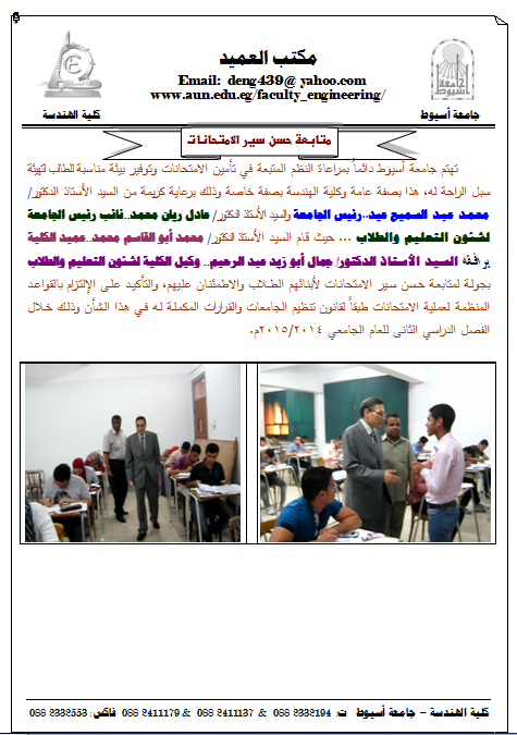 تهتم جامعة أسيوط دائماً بمراعاة النظم المتبعة في تأمين الامتحانات وتوفير بيئة مناسبة للطالب لتهيئة سبل الراحة له، هذا بصفة عامة وكلية الهندسة بصفة خاصة وذلك برعاية كريمة من السيد الأستاذ الدكتور/ محمد عبد السميع عيد..رئيس الجامعة والسيـد الأستاذ الدكتور/ عادل ريان محمد..نائب رئيس الجامعة لشئون التعليم والطلاب ... حيث قـام السيـد الأستاذ الدكتور/ محمد أبو القاسم محمد..عميد الكلية يرافـقه السيد الأستاذ الدكتور/ جمال أبو زيد عبد الرحيم.. وكيل الكلية لشئون التعليم والطلاب بجولة لمتابعة حسن سير الامتحانات لأبنائهم الطلاب والاطمئنان عليهم، والتأكيد على الإلتزام بالقواعد المنظمة لعملية الامتحانات طبقاً لقانون تنظيم الجامعات والقرارات المكملة له في هذا الشأن وذلك خلال الفصل الدراسي الثانى للعام الجامعي 2014/2015م