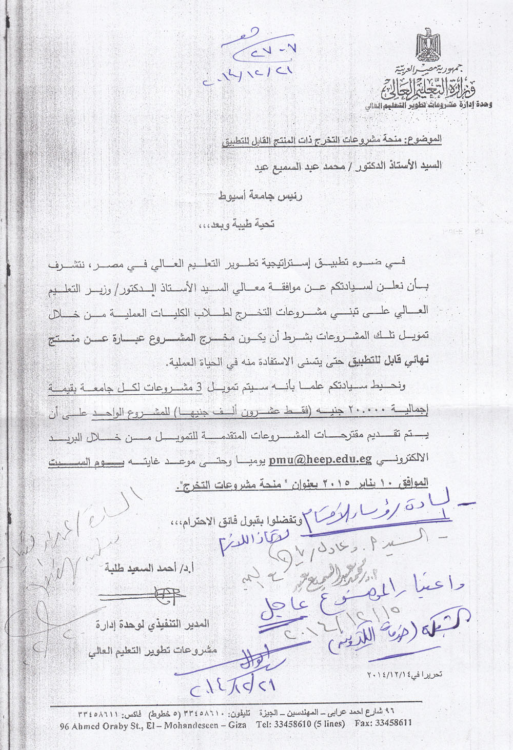 موافقة وزير التعليم العالي على تبني وتمويل مشروعات التخرج لطلاب الكليات العملية 22 ديسمبر 2014 موافقة وزير التعليم العالي على تبني وتمويل مشروعات التخرج لطلاب الكليات العملية