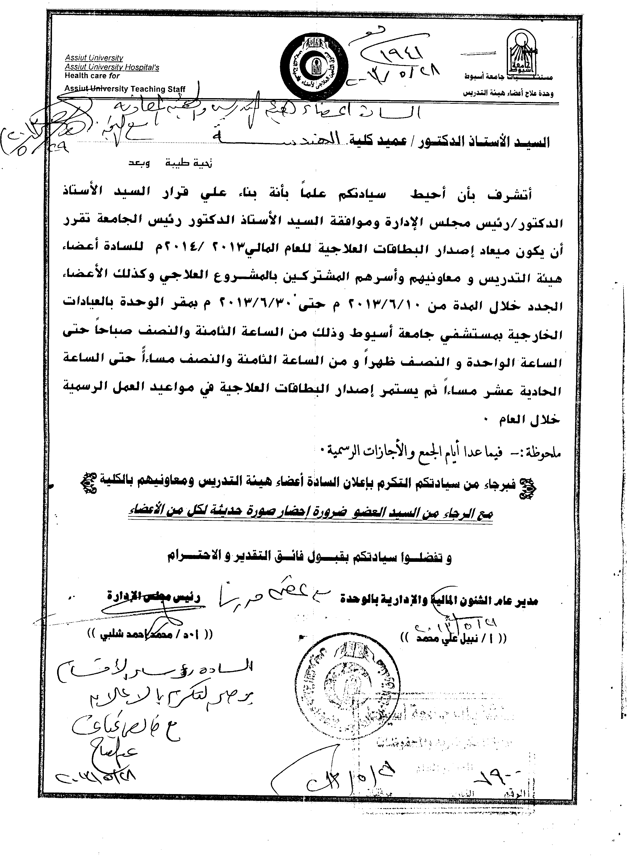 تقرر أن يكون ميعاد إصدار البطاقات العلاجية للعام المالي 2013/2014 للسادة أعضاء هيئة التدريس ومعاونيهم وأسرهم المشتركين بالمشروع العلاجي وكذلك الأعضاء الجدد خلال المدة من 10/6/2013 حتى 30/6/2013 بمقر الوحدة بالعيادات الخارجية بمستشفى جامعة أسيوط ، وذلك من: الساعة الثامنة والنصف صباحا حتى الساعة الواحدة والنصف ظهرا، ومن الساعة الثامنة والنصف مساء حتى الساعة الحادية عشر مساء.